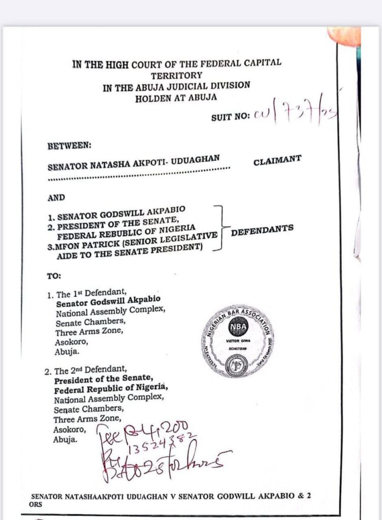 Senator Natasha Akpoti-Uduaghan has taken legal action against Senate President Godswill Akpabio, suing him for defamation and seeking N1.3 billion in damages.