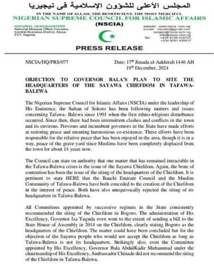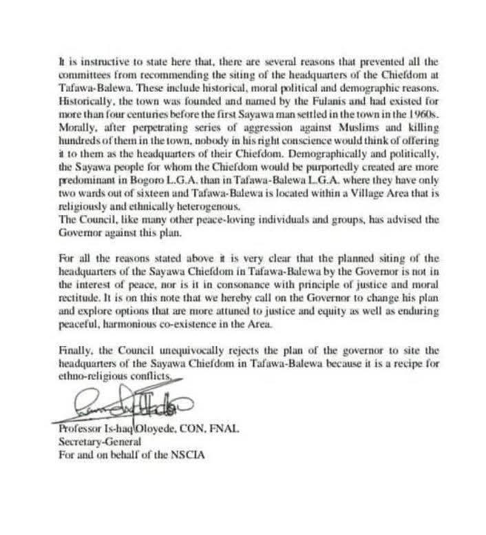 In a letter written by the NSCIA and signed by the Secretary General of the organisation Professor Is-shaq Oloyode, the Council vehemently objected to the restoration of Sayawa Chiefdom in Tafabalewa, Southern Bauchi by Governor Bala Muhammad, saying it is not in the interest of Peace.